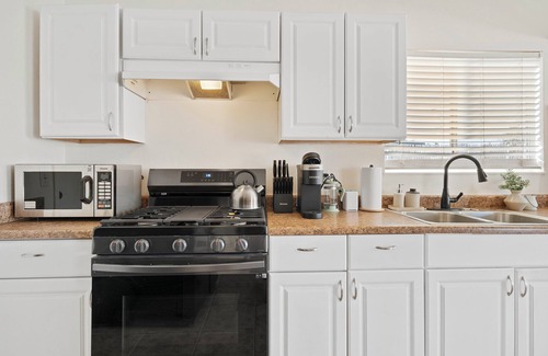 Inside, a bright open-concept living area sets the tone for connection. Gather around the dining table for home-cooked meals or settle into the cozy sectional for movie marathons on the smart TV. The fully equipped kitchen, complete with modern appliances, makes group cooking easy and fun. A dedicated laundry room ensures longer stays are effortless, so you can pack light and refresh as needed.