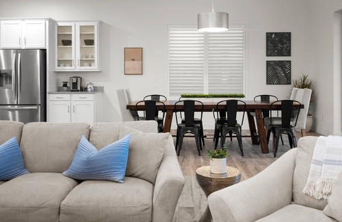 This serene home home is large enough for the entire family. As you walk into the backyard you will be met with a modern pool/hot tub (can be heated for additional cost). With plenty of seating, bistro lights, and an outdoor TV. The home is grand as you walk into the great room. A full size chefs kitchen. The Master bedroom with a king bed and an ensuite private bathroom is peaceful and inviting. With 5 guest bedrooms and one bedroom that has a desk/workspace ready for anyone to work while staying.