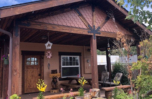 Brand new guest quarters in an eclectic location of chainsaw artist's newly renovated antique home. Guest quarters has private entrance, enclosed courtyard, parking and bath room with shower. Has closet, 3.5 cu ft mini frig, microwave, coffee maker, deck, koi pond, BBQ and front porch with picnic table. The room is large and had a queen size bed and a full size bed. 447 sq ft. This room is fully self-contained but you also have access to main house and all shared spaces if you desire.