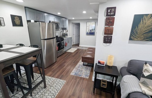 Guests will enjoy this fully renovated smart home one bedroom one bathroom ground level apartment with elegant touches and a classy living space. The living space features a sleeper sofa and a rotating 65 inch smart LED TV. A window air conditioning unit will be available during the spring and summer months. This space is also open to a 4 seat Dining table, movable 3 seat bench and an updated kitchen . Kitchen is fully equipped with the cooking necessities.