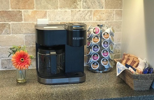 The studio space includes a luxurious king-sized bed, bathroom with walk-in shower, fully stocked kitchenette with microwave, refrigerator, and fully stocked coffee bar. Comfortable seating in the living room with a large HD TV and electric fireplace for indoor ambience. Fast Wi-Fi and multiple streaming services available in addition to the Sonos music system for listening to your favorite music on the patio or indoors.