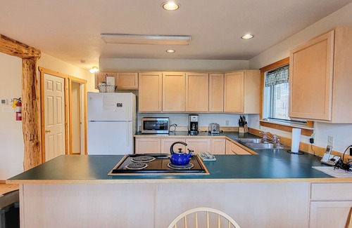 The cabin features two bathrooms, with a tub upstairs and a shower downstairs. Other amenities include a washer/dryer, dishwasher, microwave, telephone, and TV for entertainment. Outside, take advantage of the outdoor gas grill for al fresco dining amidst the forested surroundings. Guests should note that access to the cabin is via a dirt road. In winter, when snowfall is abundant, all-wheel drive vehicles are recommended for safe travel to and from the cabin.