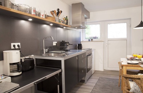 The apartment is located in the side wing of the total building of 750sqm usable area. The apartment is ideal for one person but can accommodate 2 people and has 1 bedroom with 1 bed of 1.40m and 1 bathroom. The kitchen has a fridge-freezer, 4 plate stove, oven. Toaster, coffee maker, espresso machine, kettle. As a rule, salt, pepper and various spices are available. Coffee and sugar should always be there. Mineral water is in the fridge.