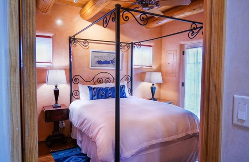 Galisteo Casita is situated a 15-minute walk or 5-minute drive to all of Santa Fe's superb restaurants, art galleries, the hospital, shopping, museums and the famed downtown Plaza. In the winter, Ski Santa Fe is just a quick jaunt away.At the end of your day, your family can unwind and relax by the fire or enjoy the outdoor living space in the enclosed courtyard. The primary bedroom features a spacious closet and accompanying ensuite bathroom. The second bedroom features a queen bed and plenty of space to unload your belongings you bring to your Santa Fe getaway.