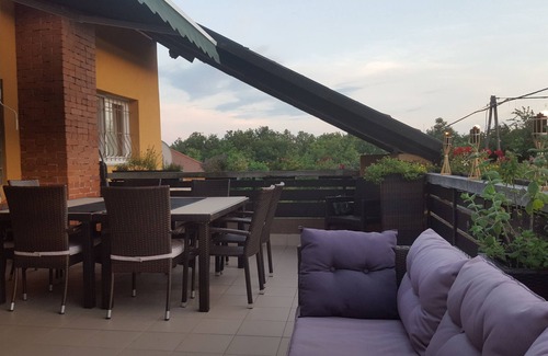 Pure nature in the romantic country house, completely relax. We have the right for you. Our cottage / her house is located at the forest edge of a beautiful setting near the famous lake in Hungary the warmest lake Velence. The property is not fenced and is located in the great outdoors. The interior is decorated in country style and created a very cozy atmosphere. From the terraces of the Ferienhauseses you have a wonderful view over the lake Velence and the environment. The house is located next to the living room with fireplace, 4 bedrooms, 2 bathrooms with shower and toilet, a fully equipped kitchen and dining area, large terrace (25 m2 and 50 m2), wine cellar and parking for 4 cars. Leisure and sports facilities close by: hiking, biking, horseback riding, swimming golf, tennis, and various maritime activities such as ballooning, sailing, canoeing, fishing, wakeboarding, etc.. Country House for more than 10 persons, on 3 floors.