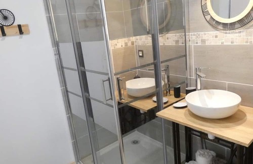 The bathroom has been renovated in an original way thanks to an old sewing machine. Labeled Tourism and Handicap (mental, motor, visual and hearing).