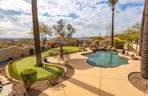 This oasis in the heart of the desert hosts, a heated pool with a waterfall, fire pit, 9-hole putting green, 1 fireplace, outdoor BBQ kitchen, baseball hoop area, ping-pong, pool table, slapback shuffleboard, poker table, “Golden Tee” machine, a 4 person arcade with 1,300 games, dart machine, air hockey, foosball, double “pop a shot”, all smart TV's, Direct TV and free wifi, and more.