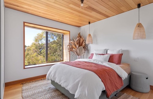 Three light and spacious bedrooms sleep six guests, all featuring queen-size beds. The second and third bedrooms are located downstairs and are serviced by the sleek and contemporary main bathroom, appointed with a walk-in rain shower, modern vanity and stylish lighting and tile features. The primary bedroom upstairs includes a bright, white ensuite with a luxurious walk-in rain shower, plus a modern vanity and mirror.