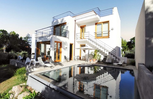 The villa is easily reachable by car from the nearest airport connection, which is approximately 60 minutes away. Public transport is available nearby, making it easy to explore local attractions. Parking is available within the villa premises.