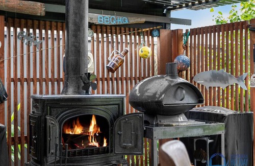 The kitchen has everything in it you’d need for a holiday or longer, including all mod cons such as a microwave, dishwasher and coffee machine. Stools at the benchtop invite social cooking. The living room is open plan with the kitchen looking out over the dining suite which seats 6, and through to the lounge with a luxury leather sofa and armchairs facing the smart TV. A DVD is available for your use. Overhead fans and reverse cycle air conditioning will keep you comfortable. Sliding doors open out from the kitchen/dining to the outdoor entertaining area. This is a fantastic covered patio, and includes pull down blinds so is suitable for all weathers. There is an outdoor dining suite for 8, a BBQ, outdoor fridge, a wood fire for warmth, a TV and a bar table with stools. You’ll spend lots of time enjoying this space!