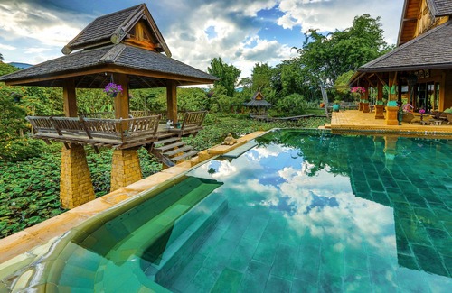 Howie’s Homestay Resort in Chiang Mai, Thailand as featured in Architectural Digest and many other luxury home magazines is a one of a kind luxury villa resort located in the Mae Rim valley just 30 minutes from the Chiang Mai city center. This five star deluxe resort property located minutes from the Four Seasons Resort Chiang Mai is complemented by four acres of masterfully landscaped lush tropical gardens, breathe taking mountain views, a huge infinity edge swimming pool, ponds, fountains, and even an outdoor theatre. This luxurious gated private estate villa was built in traditional Royal Lanna style featuring seven separate pavilions and built to super deluxe western standards by renowned designer, Bill Bensley. If you are looking for something truly unique that will even surpass an experience at the Four Seasons Tented Camp in the Golden Triangle, The Mandarin Oriental Chiang Mai or any 5 star hotels, accommodation, property in Thailand, then Howie’s Homestay Resort is the perfect choice for you.