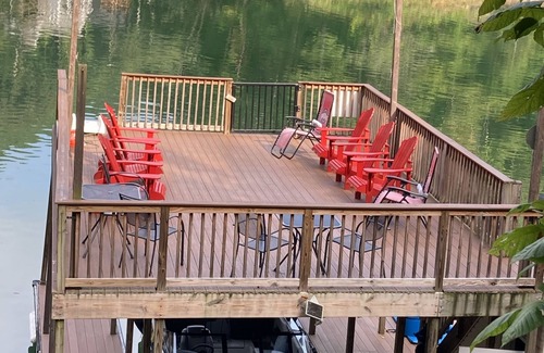 It’s Five O’clock Somewhere is a luxury lakefront home located in the gated community of Lakeside Estates. It is in a protected, no wake, SEASONAL (April 1st - mid-October) DEEP WATER COVE on beautiful clear Norris Lake. This 4 ½ story, 4000 square-foot home provides 9 bedrooms and 5 1/2 bathrooms and sleeps 22(up to18 adults). There is ample indoor and outdoor seating for meals and gatherings. The outside steps lead to your own two-story covered dock with a slide. Our dock can accommodate 2 boats. The home provides access to large outdoor and indoor spaces. There are three large 30 foot outdoor decks, and two of them are covered with rain guard which allows usage even on a rainy day. There is an indoor fireplace and an outdoor fire pit. There are 2 outdoor furniture sets, a picnic table, wooden chairs at an outdoor bar, and a swing for large group seating. The 6 person hot tub sits under the starry night sky. There is a gas grill and gas griddle for big group cooking.