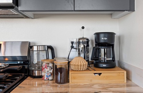 ✔ Primary Bedroom – King-size memory foam bed, Keurig coffee maker (yes, coffee in bed!), blackout curtains & ample storage.