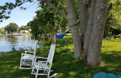 Imagine yourself relaxing on a lawn chair sipping iced tea with a warm breeze, a good read and listening to the lapping of gentle waves while gazing at miles and miles of nothing but blue water. Maybe you would rather take one of our many kayaks across to the Frenchman's Island and explore or swim and play corn hole toss, and have a cookout in the lawn . How about sitting by a campfire watching an incredible sunset telling new and old stories. Maybe nature is something you would rather see from inside. The view from the living/dining/kitchen of the Haven is something that just captivates, intrigues, and never gets old. Beautifully landscaped, and comfortably decorated lakefront property with a private dock ,a large yard and patio with comfortable outside seating, a gas fire pit for nights you don’t want to hang out by the wood fire. Remember to bring wood for The lakeside wood fire pit and enjoy sitting in the lakeside comfortable adirondack chairs .