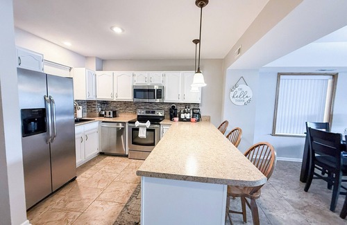 The fully stocked kitchen includes stainless steel appliances, a coffee bar, and everything you need to cook at home, with bar seating and a large dining area ideal for meals or game nights.