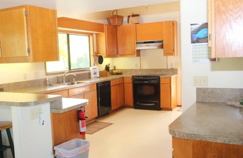 Located on a private road, this LARGE 5 bedroom 4 bath home is ready for your Private Get-a-way. The Kitchen is Spacious with room for all and has all of our standard amenity’s such as Stove, Refrigerator, Dishwasher, Garbage Disposal, Toaster, Blender and more. The dining table seats ten, and there are three bar stools at the Kitchen counter.