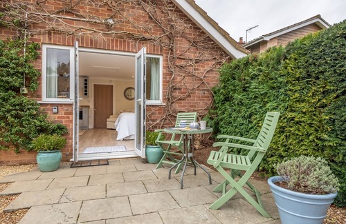 Thoughtfully designed to make the most of the available space, the open-plan living environment comprises of a sitting area providing a sumptuous sofa, an inviting dining area with space for two guests to gather around a delightful farmhouse table, and a well-equipped kitchen with an electric oven and modern appliances. Dressed with fine white linens, a restful night is provided by the comfortable king-size bed. This room is served by an accompanying a shower room hosting large walk-in shower. Ample natural light is provided by charming dual aspect arch windows, and large french doors. Styled with a muted colour palette and finished using high-quality soft furnishings, this property invites relaxation and comfort.