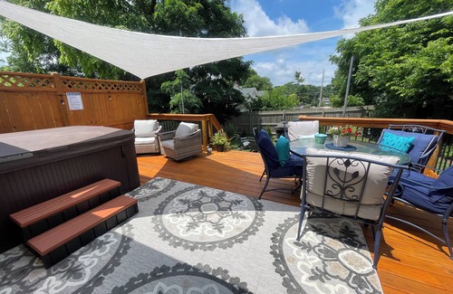 Stay in a 1920s "American Four Square" home in the cutest part of downtown Georgetown! New HOT TUB, a fully STOCKED kitchen, Blackstone gas grill, wonderful outdoor spaces, private deck/yard with a fire chimney (wood provided). Enjoy all the amenities of a clean, comfy home while visiting the bourbon trail, Kentucky Horse Park, ARK (33mi), Lexington concerts, college student visits & more. Guests love our 5-star "𝐠𝐮𝐞𝐬𝐭 𝐟𝐚𝐯𝐨𝐫𝐢𝐭𝐞" approach. We're 100% hospitality value-driven hosts!