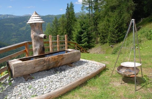 Relaxation at 1680m - comfortable & cozy atmosphere On the ground floor there is a cozy snuggery with sitting area and relax lounger, kitchen part, hot water, washing dishes and wood stove. In the immediate vicinity of the unique, made of pine wood double room is an Innentoillete, a cool storage cellar and the bathing area with an original Finnish sauna with wood stove and shower. Cuddly warmth is provided by central heating fired by the snuggery. Above the vestibule with cloakroom you will reach the exit with covered terrace with several seats, where you can enjoy the magnificent view over a unique mountain world. The upper floor has a double and a quadruple room. A photovoltaic system provides enough power for everyday life. In addition, a barbecue area and fountain in front of the cottage for the corresponding romance. The Müllnerhütte is a self-catering hut and can be reached by car at your own risk. Bed linen, tea towels & towels etc. are to be brought along.