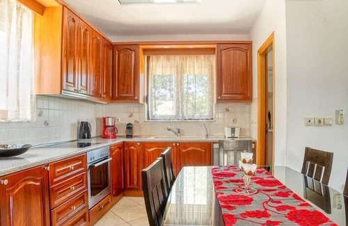As you step inside, you'll be greeted by the inviting open-plan layout, seamlessly merging a comfortable living room with a conveniently adjacent dining area. The kitchen, boasting its own dining space, is thoughtfully outfitted with all the necessary amenities to cater to your culinary needs. The residence comprises three well-appointed bedrooms, each tastefully air-conditioned for optimal comfort. Two of these bedrooms feature plush double beds, while the third offers two cozy singles, catering perfectly to families with children or groups of friends. A full bathroom, complete with a relaxing bathtub, accompanies a separate WC for added convenience.