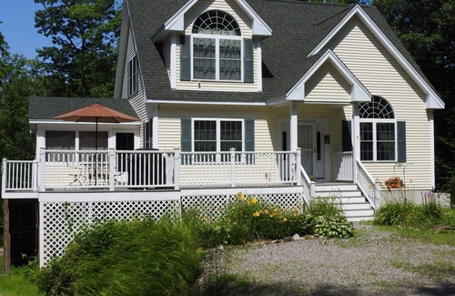 This recently built custom summer cape sits on an acre of land, on a private road, with a short walk to direct lake access with over 60' of shared shoreline on the water's edge. Enjoy the perennial garden and pick wild berries that are scattered around the property for your breakfast. You'll relax in the "Golden Pond" experience with loons, eagles and great fishing on this crystal clear lake. You'll also enjoy swimming and boating from shared lake access that offers a gradual sandy bottom and dock. Even if you don't have a boat the owner provides a row boat, sunfish sailboat, pedal boat and kayaks at no additional cost for weekly rentals. Power boat and pontoon rentals are also available.