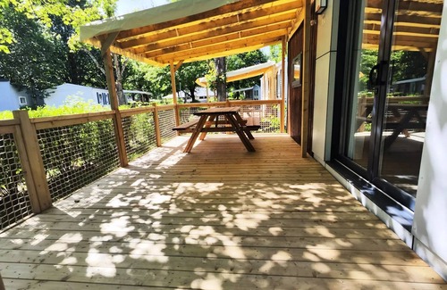 Accommodation: Our Mobil Homes "Grand Confort" can accommodate 4 to 5 people. They consist of a living room kitchen, dining table, with a bench that can act as sleeping 2 people. One bedroom with two single beds and another bedroom with two single beds. Two bathrooms with two toilets. A covered terrace.