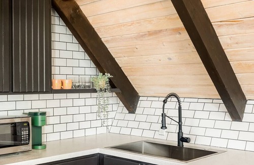 Our a-frame cabin has two bedrooms and one full bath. The first floor has one bedroom with a King bed. The bathroom is across the hall from the King room on the first floor. The kitchen and dining/living room area is one big, open space on main floor with the deck off of the living room area. Upstairs you'll find a walled-off loft area with a queen bed + a twin trundle combo. Enjoy the super fast WiFi while working from the cabin or watching movies on the Smart TV.