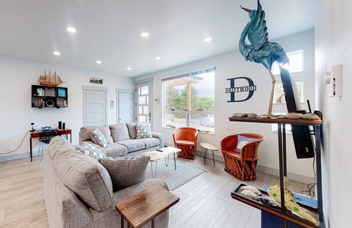 Located just a mile from the water and local shops, this open concept, modern getaway is a wonderful space and a great option for anyone seeking the unparalleled beauty and adventure of the Oregon Coast. This home is newly-constructed and has low-key nautical touches throughout. Prepare your favorite recipes in the well-equipped, island kitchen with stainless steel appliances and counter seating, and then dine indoors at the table for six, or outside on the the furnished patio. The front-facing living area is furnished with a sofa and loveseat and also includes a desk and chair for remote work or schooling and a flatscreen TV for streaming your favorite channels.