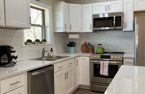Waterfront house with wide, covered deck to enjoy the stunning main-lake views. Large back yard, sloping to the private, secluded pebble beach--where there is a day dock perfect for swimming off of. Beautiful, fully renovated three-bedroom home with a great open living room and kitchen that--when the wide patio doors are open--flows right onto the stunning deck. Primary bedroom has a king bed and en suite bathroom with walk-in shower and walk-in closet. Guest room has a queen bed and is across from hallway bathroom with tub/shower combo. Bunk room has two twin bunk beds and adjoining half bath. Queen size blow up mattress for great room (or deck) sleeping. High speed internet and smart TVs. Perfect for a family getaway and just minutes away from great restaurants, grocery stores, and night life. Follow us on Instagram: @thehouseongrand