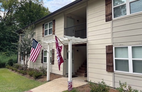 Lovely, freshly-updated, upstairs unit just steps from Mississippi State University Campus. The Hump, Dudy Noble and Davis Wade stadium are all about a 15 minute walk. The Cotton District is approximately 1.5 miles. A SMART transit stop is across the street from the driveway of the complex. Features a King, a Queen, and a Queen sleeper sofa.