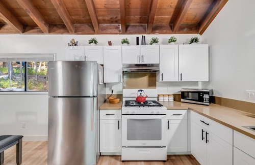 Navigate Stays presents this comfortable and clean modern cabin in Lake Arrowhead. Featuring new floors and no carpet. Enjoy your mornings on the small patio with a bistro table and chairs, listening to the sounds of wildlife. With private parking, 2 bedrooms, and 1.5 bathrooms, this cabin is ideal for a relaxing stay. The master bedroom features a king bed and ensuite bathroom, while the second bedroom offers a twin and full bed. TVs in all rooms ensure entertainment for everyone.