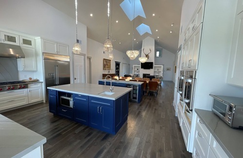 Built with commercial size Fridge/Freezer, Bar Fridge, double Cafe’ Ovens and Warming Drawers, Wolf -6 Burner Gas Range and Hood, Shaw Farmhouse Sink, large double Islands, Natural Quartzite Countertops with Shaw prep sink and 3 Miele Dishwashers.