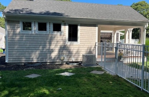 This cozy guest suite is ideally located, approximately 1.5 miles from the ocean and bay beaches in Eastham, and just a quarter mile from the bike trail. It features an outside covered seating area and an en suite bathroom for added convenience. The suite includes a small kitchenette with a Keurig coffee maker, microwave, and mini fridge, plus a mini split AC and heat. Guests also have access to a communal pool and hot tub. Perfect for one or two people seeking a relaxing affordable getaway!