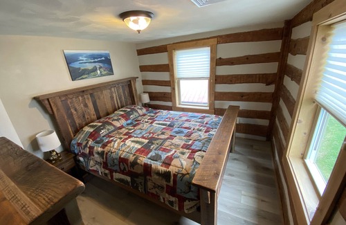 Upstairs is accessed by the original pine steps that were built over 100 years ago, steps are steep and narrow but there is a solid railing for security. The first 2 bedrooms each have have a queen bed, dresser, and night stands with restored exposed log and chinking on exterior walls. The larger master bedroom has a king bed with dresser, night stands, and chair for reading/relaxing. The master bedroom also features a small balcony for morning coffee or evening sunsets with a spectacular view of the northern end of Raystown Lake and Terrace Mountain. There is an en suite bathroom in the master with a custom tiled shower and custom made vanity with stone top (both bath vanities are made from old barn boards salvaged from the original barn on the property). Washer and dryer are also in a laundry closet in the master bath and are available for guest use (HE detergent only). The second bath features a bathtub/shower with custom tiled walls and granite top on vanity. Towels are provided as well as linens for the beds. House is best suited for 6 guests assuming double occupancy in each bedroom, we do allow a maximum of 8 guests but would require sleeping on sofa or air mattress in living room.