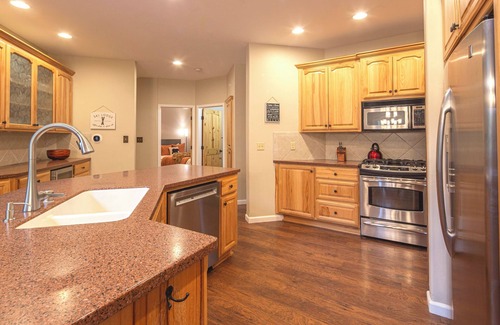 The fully stocked kitchen, with stainless steel appliances and ample counter space, makes meal prep a breeze—whether it’s a hearty breakfast before hitting the hiking trails or slopes, or a gourmet dinner to wrap up the day.