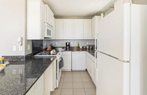 Both bedrooms are thoughtfully styled with clean, coastal touches, and the bonus sleep sofa gives everyone a cozy spot to crash after a day of salty air and seaside adventures. A sleep sofa in the living room provides additional space.