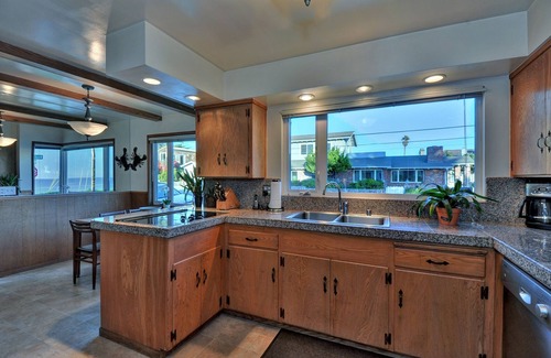 Enclosed backyard offers a spacious, comfortable place for gathering, in a private outdoor setting. Large sliding glass windows deliver great ocean views from a backyard setting! A perfect place to meet for lunch, or enjoy dinner, after a fun day at the beach. Barbecue and accessories provided. Additional patio furnishings and table-tennis equipment stored in garage.