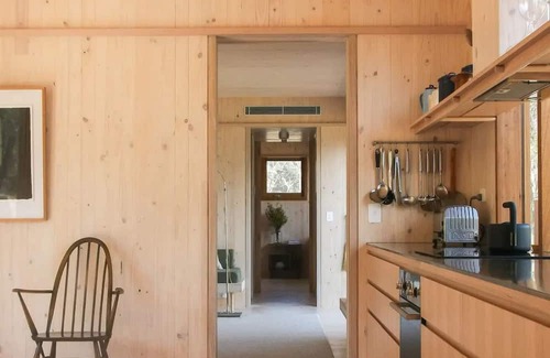 The main dwelling has two bedrooms and two bathrooms with large open living areas designed to connect occupants with the surrounding landscape.