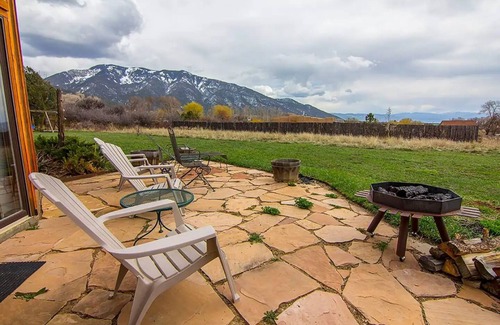 The home has comfortable living furniture with a large fireplace. The bedrooms are all separated, king bedroom with spa like ensuite bathroom. The queen bedroom has a desk if work needs to be done and a door into the hall bathroom. The third bedroom has a set of bunk beds and a double futon. The kitchen has a large gas range and oven, fully equipped with everything you need to stay in and cook. Outside there is plenty of patio furniture, a fire pit and gas BBQ. You will feel like you are in the country with views forever to the south and west and the mountains right out your front door, you are however only a bit over a mile from the artisan village of Arroyo Seco and the Ski Valley Road. The home sits roughly 11 miles from the Taos Ski Valley and 9 miles from the Taos Plaza.