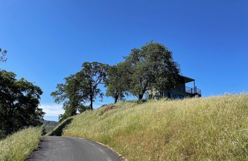 This brand-new Tiny Home upstairs unit overlooking vineyards, lake New Melones and rolling hills with majestic oak trees will quickly put you into a state of tranquillity and peace. Imagine sitting on the big private deck enjoying a glass of wine from our local wineries and reading your favorite book with a breeze from the lake cooling you off. This is modern sustainable art of living on a small footprint, yet it offers all the beauty of simple living with modern comfort such as wifi, A/C, washing machine and a well equipped kitchen for own meal preparation. Our built- in bed can serve as a twin day bed or transform into a king size bed for two nestled right next to a big window overlooking an oak tree.