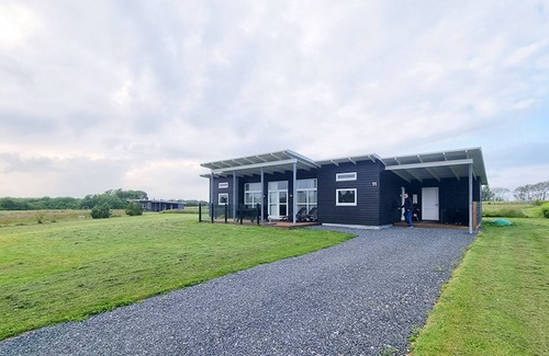 The interesting construction of this holiday home attracts everyone's attention. Located on a beautiful nature plot, this stylish house presents itself in an appealing anthracite-colored facade. While the big vacationers make themselves comfortable on the partially covered terrace, the little vacationers can spend their time on the lawn to their heart's content. A special highlight of the terrace is an area reminiscent of a lounge. A glass band attached to the side of the terrace also protects against the wind.