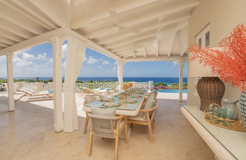 Sitting on just over half an acre of land Aquilae is a single level 5 bedroom villa that can comfortably sleep up to 10 guests. Aquilae comes with a housekeeper 6 days per week and a laundress 2 days per week. A Cook or Chef is available daily for an extra charge. The interior space includes five bedrooms with en-suite shower rooms, a well-equipped kitchen, an open plan living area with a bar which all open onto the expansive, full-length patio and pool terrace leading to the large infinity pool. There is a huge stone dining table under cover on the terrace and a stone bar which is very popular for sundowners. In addition there is a gym, a TV room and a small home office.