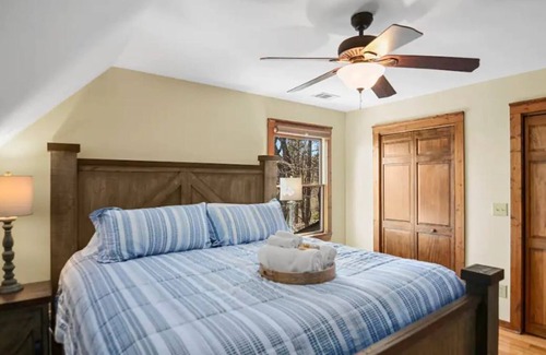 The master suite is located on the main level and features a king-sized bed, roku tv, private bath, and access to the deck where you can sit and enjoy the outdoors.
