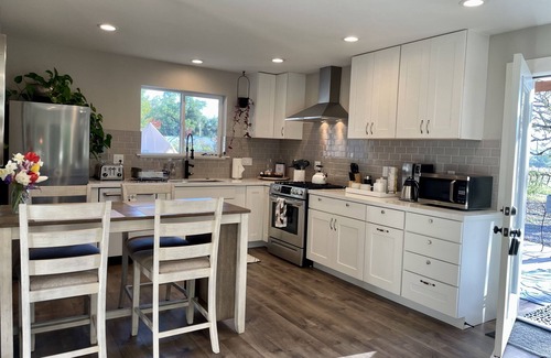 The inside of the home is equipped with a primary bedroom, furnished with a plush queen bed. Dual windows open to the private backyard with extended views of gorgeous free range horses, redwood and oak trees. Blackout shades are installed in both bedrooms. Just outside the master bedroom is the bathroom, consisting of a fresh and modern design, black hexagon flooring, concrete shower walls and a marble single vanity. The shower also has a bathtub for some soaking time. Fully stocked with shower necessities, towels and a hair dryer. The next room is furnished with a daybed / trundle doubling as a two twin XL sleeping arrangement. The kitchen is fully stocked, so you can cook away! Furnished with stainless steel appliances and a gas range. The living room view sits in front of a large window and a sliding glass door with natural light and views to flooding in during your stay.
