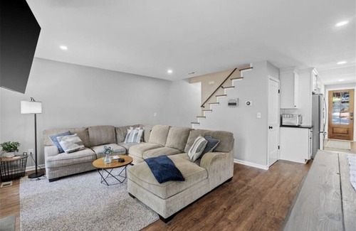The downstairs of the home is a finished basement that offers another living area with couches, chairs, high-top table and stools, a smart tv, a foosball table, and access to the outdoors.