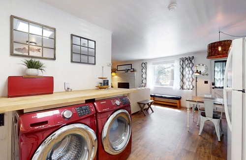 The open living space offers a tasteful vintage vibe and modern furniture including two chairs, a queen sofa bed, and a rocking chair. Settle down for the night in front of the 42in TV and warm up by the wood-burning fireplace.