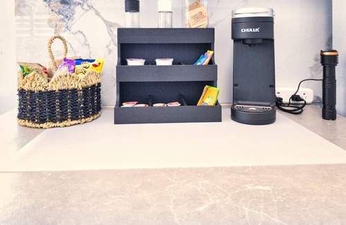 Our kitchen is fully equipped with brand-new appliances and all essential cookware, perfect for preparing meals at home. Enjoy a cup of coffee with our dedicated coffee station, equipped with a pod coffee machine, manual espresso maker, and basic supplies.