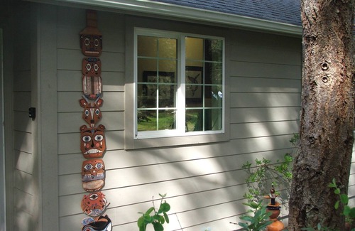 Our vacation rental home provides 2 full bathrooms and 3 bedrooms, each with a comfy queen sized bed with quality bedding. One room is a true master with a private bath and 24' television. The open concept living space features a vaulted ceiling, a local artisan designed and built fireplace area, a free standing gas burning fire place, and a 42' television. Both TV's have DVD players and Direct TV. We also provide free WIFI, a full size Washer and Dryer, Dish Washer, VCR, Coffee maker, Toaster, Microwave, a Pack'n'Play, and a propane barbecue. The kitchen is stocked with the basics such as spices, flour, sugar, etc. as well as an array of dishes, utensils and pots & pans.