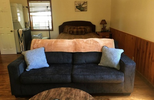Red Oak Getaway, 131 Archway Lane, is a one room cabin with bathroom in Searcy County near the Buffalo River. It is located app. 9 miles on Hwy. 27 North. It is the perfect distance to the Buffalo River and it is 2 miles from Crockett's Canoe Rental. This cabin will sleep 4 with a sleeper sofa.