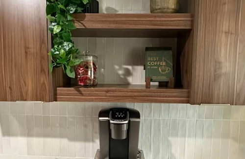Inside, the home balances design and comfort. The living room is filled with natural light and furnished with comfortable seating and curated décor. The kitchen has brand-new stainless steel appliances, fully stocked with cookware and essentials, along with a dining space that also works well as a desk for remote work.